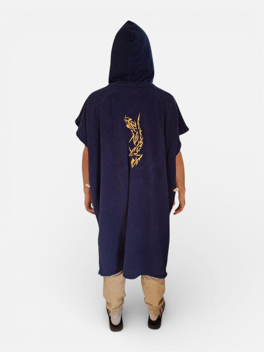 Poncho bleu en éponge de qualité avec 2 poches ventrales et une capuche.