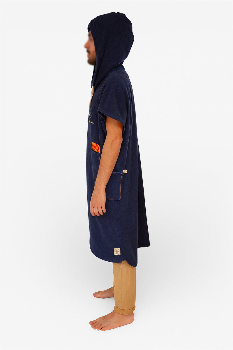 Poncho bleu en éponge de qualité avec 2 poches ventrales et une capuche.